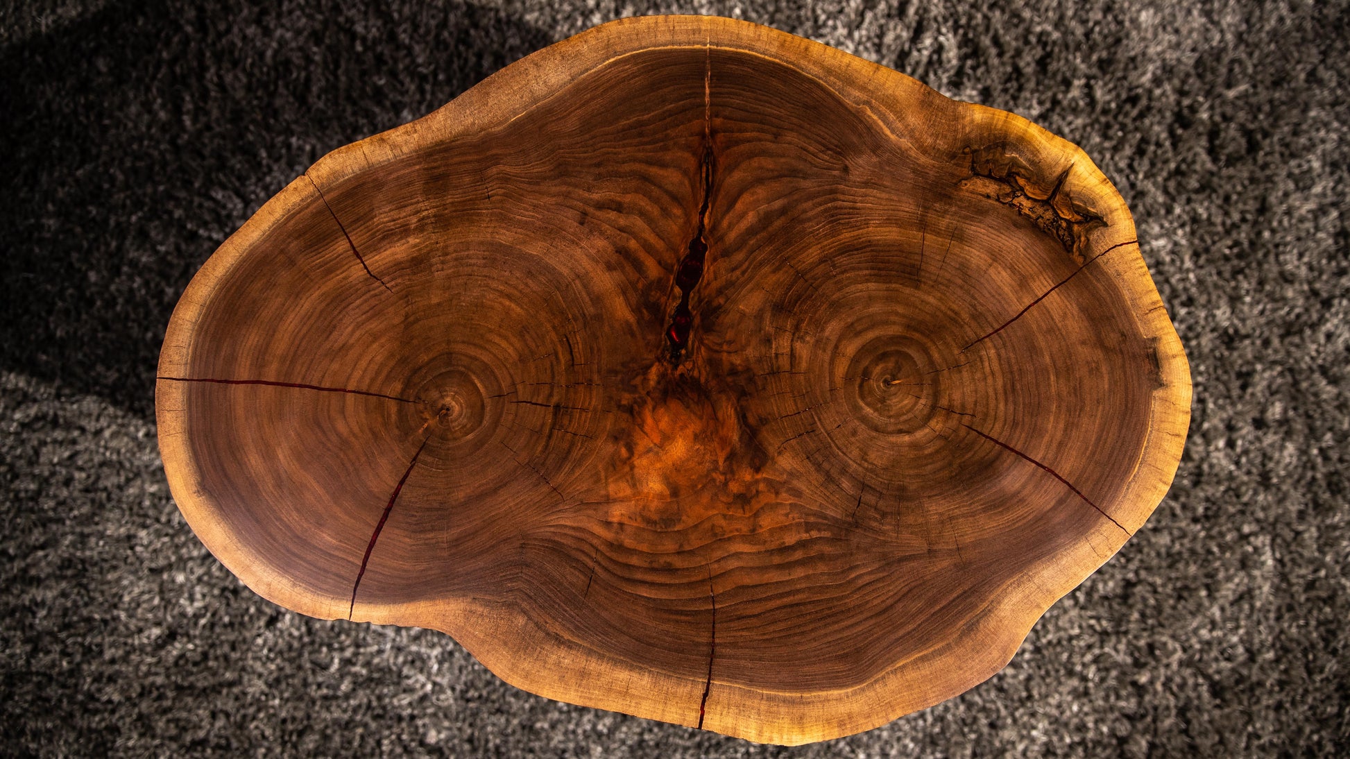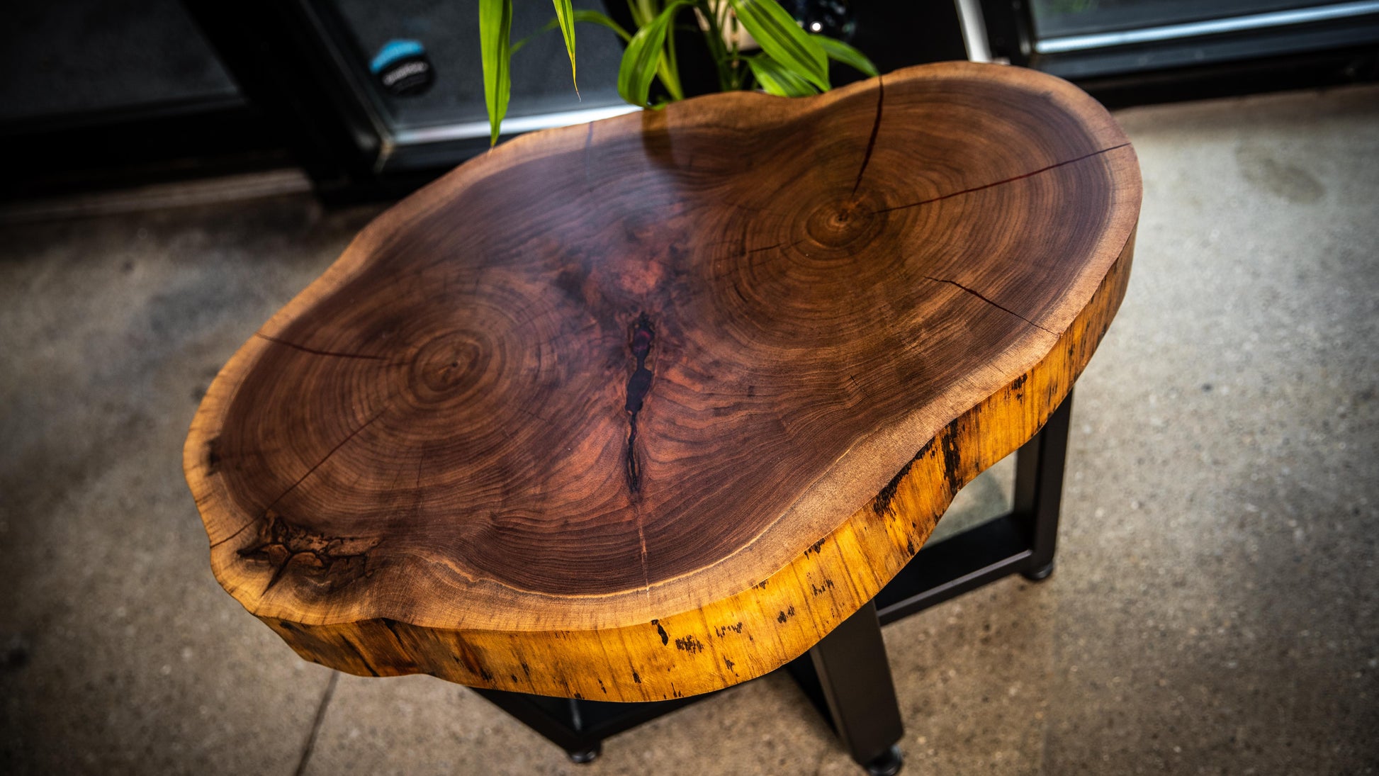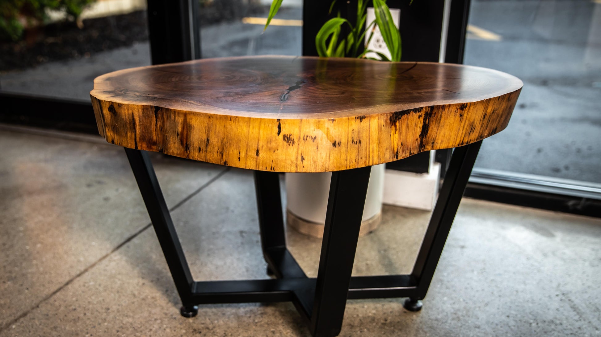 This walnut round table lets you hold court from the comfort of your living room. Cut from the break of two major branches, this tabletop highlights multiple growth rings, figured pattern, and a live edge. This lovely top is supported by custom made metal base with sweeping angled legs and adjustable feet.